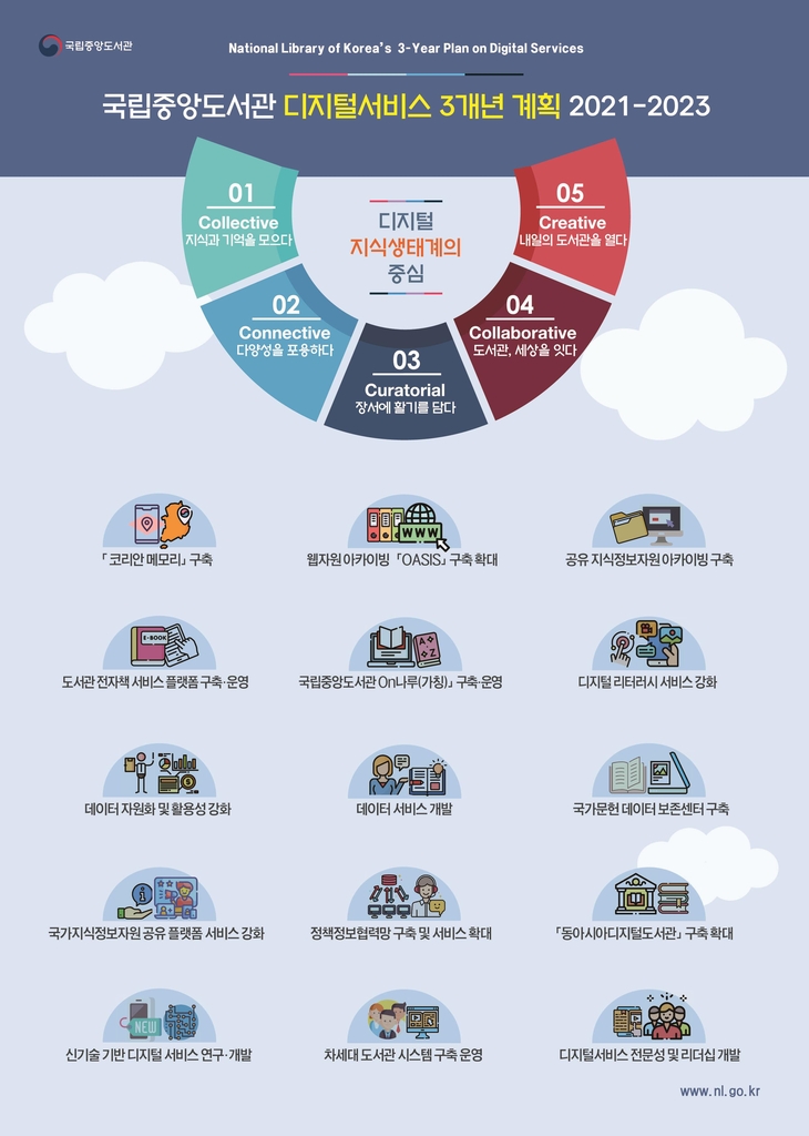 디지털 서비스 3개년 계획 핵심은 전자자료 확대다. 국립중앙도서관은 전자책 등 디지털 장서를 1천670만 권에서 2천70만 권으로 400만 권 늘리고, 한국과 관련된 자료를 모은 디지털 아카이브 '코리안 메모리' 장서도 15만 권에서 21만 권으로 증가시킬 계획이다.