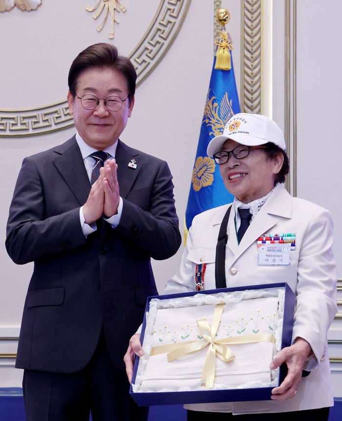 President Lee Jae Myung (L) applauds next to Korean War veteran Lee Chun-ja during a luncheon meeting for people of national merit, war veterans, bereaved families and representatives of veterans' organizations at the former presidential office, Cheong Wa Dae, in Seoul on June 27, 2025. (Yonhap)