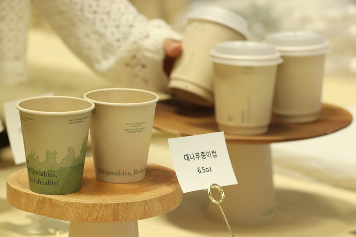 Paper cups made of bamboo are displayed at the COEX exhibition center in Seoul on July 18, 2025, during an exhibition on the vegan industry that aims to help vegans make their lives easier with a variety of cuisine and other goods. (Yonhap)