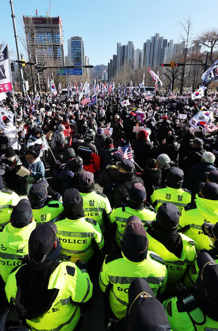 Supporters of impeached President Yoon Suk Yeol rally in front of the government complex in Gwacheon, just south of Seoul, on Jan. 15, 2025, as Yoon undergoes questioning before investigators at the Corruption Investigation Office for High-ranking Officials following his detainment earlier in the day in connection with his short-lived imposition of martial law. (Yonhap)