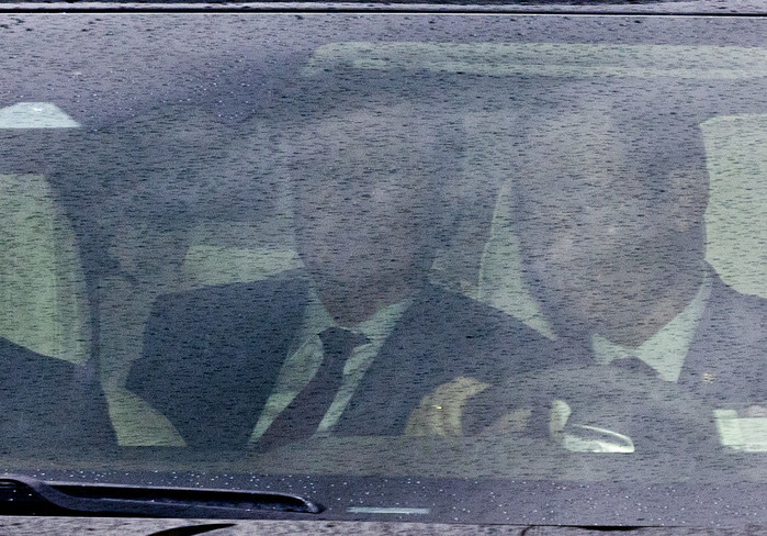 Former President Yoon Suk Yeol (L) is seen in a car entering the Seoul Central District Court on April 14, 2025, ahead of his first criminal trial on insurrection charges related to his brief imposition of martial law in December. Yoon defended himself during the trial, saying his attempt to impose martial law did not amount to an insurrection. (Yonhap)