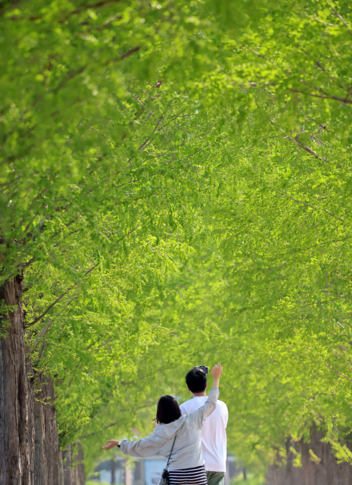 People walk through a green canopy of metasequoia trees on a road in Gangneung, a town in South Korea's northeastern province of Gangwon, on April 29, 2025. (Yonhap)