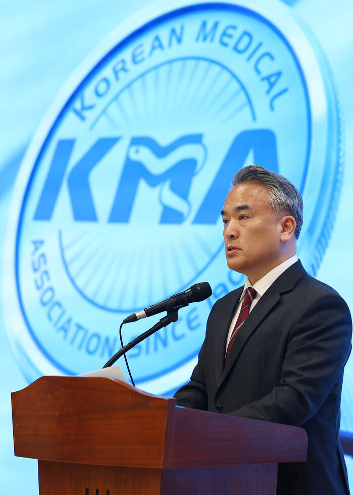 Kim Seong-geun, spokesperson of the Korean Medical Association, speaks during a press conference at the association's headquarters in Seoul on April 8, 2025. (Yonhap)