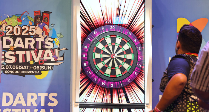 A player throws a dart during the K-Darts Festival, an annual international electronic darts festival, at the Songdo Convensia in Incheon on July 6, 2025. (Yonhap)