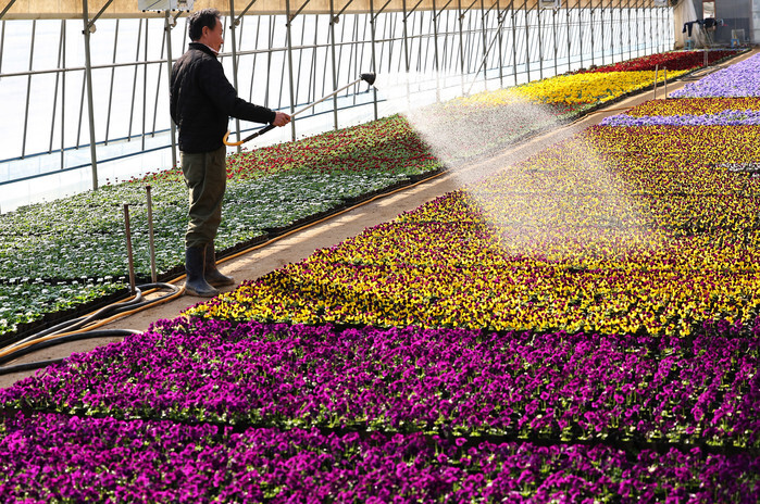 An official of a flower nursery in Anyang, south of Seoul, waters flowers that will be transplanted to flower gardens or parks in the spring on Feb. 17, 2025. (Yonhap)