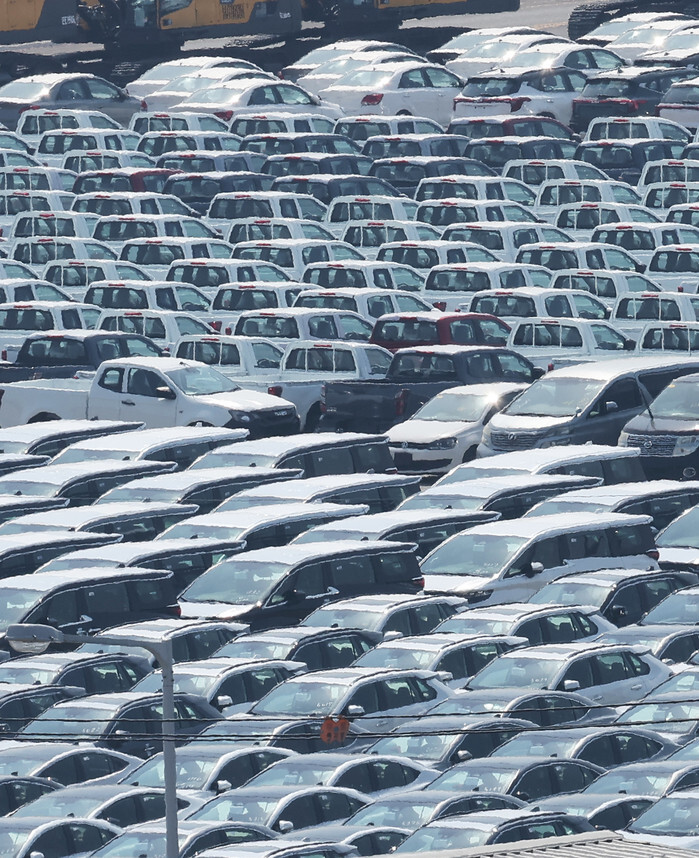 Cars await shipment at a port in Pyeongtaek, south of Seoul, on March 31, 2025, as South Korea is making all-out efforts to fully prepare for the U.S. administration's planned imposition of reciprocal tariffs. (Yonhap)