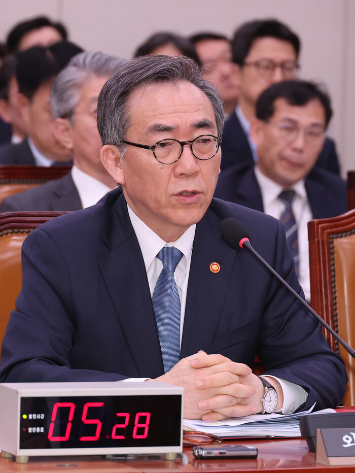 Foreign Minister Cho Tae-yul responds to a lawmaker's questions during a plenary session of the diplomacy and unification committee at the National Assembly in Seoul on March 24, 2025. (Yonhap)