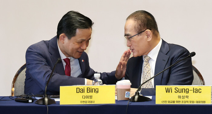 Wi Sung-lak (R), a lawmaker of the main opposition Democratic Party, talks with Chinese Ambassador to South Korea Dai Bing at the National Assembly in Seoul on March 27, 2025, during a meeting of experts versed in cooperation among South Korea, Japan and China. (Yonhap)