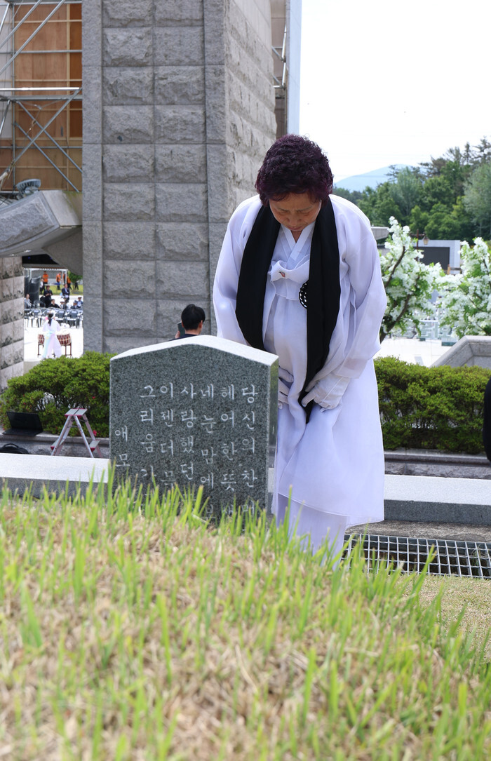 A bereaved family member of a victim of the 1980 Gwangju Uprising pays respect at the May 18 National Cemetery in Gwangju, 267 kilometers south of Seoul, on May 17, 2024, one day prior to the 44th anniversary of the pro-democracy movement. Hundreds of people were killed in the city during protests against the military junta led by late President Chun Doo-hwan. (Yonhap)