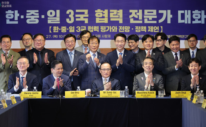 Wi Sung-lak (C, 1st row), a lawmaker of the main opposition Democratic Party, Japanese Ambassador to South Korea Koichi Mizushima (2nd from R, 1st row), Chinese Ambassador to South Korea Dai Bing (2nd from L, 1st row) and other participants pose for a group photo at the National Assembly in Seoul on March 27, 2025, during a meeting of experts versed in cooperation among South Korea, Japan and China. (Yonhap)