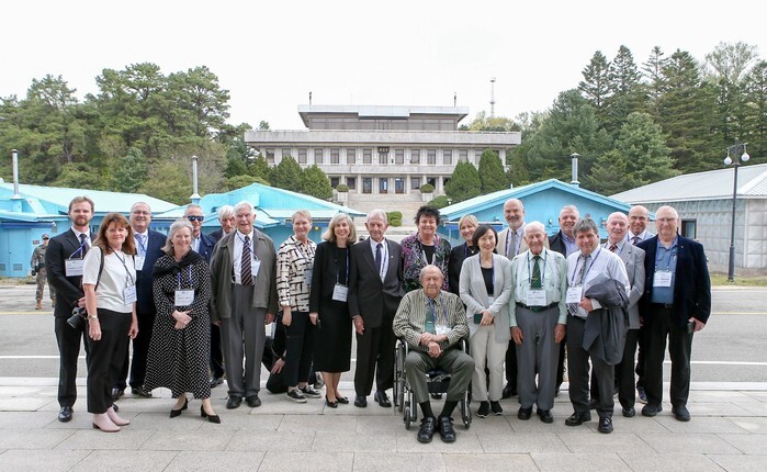 Korean War veterans and their family members from four British Commonwealth nations -- Britain, Canada, Australia and New Zealand -- pose for a photo during a visit to the South Korean side of the inter-Korean truce village of Panmunjom in Paju, 30 kilometers north of Seoul, on April 22, 2024, in this photo provided by the veterans ministry. Sixteen nations fought for South Korea against invading North Korea during the 1950-52 conflict. (PHOTO NOT FOR SALE) (Yonhap)
