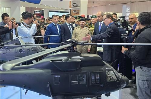 This undated photo, provided by the state-run Korea Aerospace Industries Ltd. (KAI), shows KAI President Kang Goo-young (3rd from R) explaining the South Korean-made KUH Surion helicopter to Iraqi Defense Minister Thabet al-Abbassi (4th from R) at the International Defense Exhibition Iraq 2024 in Baghdad held from April 20-23. (PHOTO NOT FOR SALE) (Yonhap)