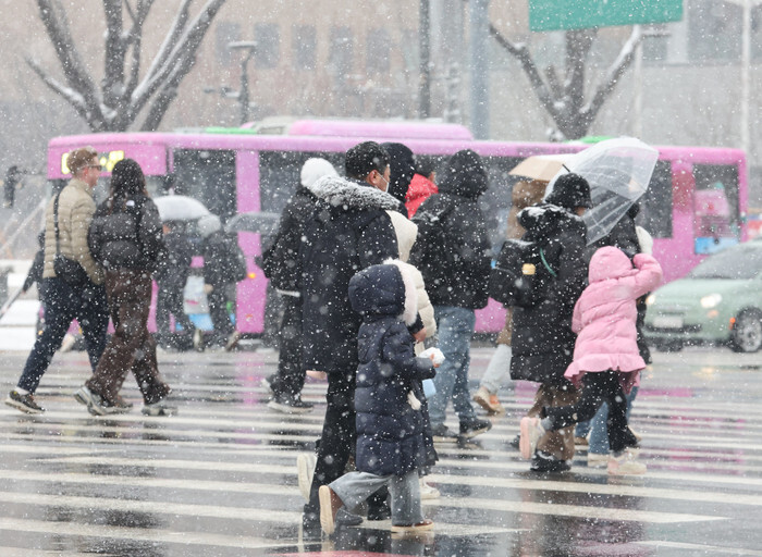 People walk across a crosswalk near Gwanghwamun Square in central Seoul on Jan. 31, 2025, amid snow. (Yonhap)