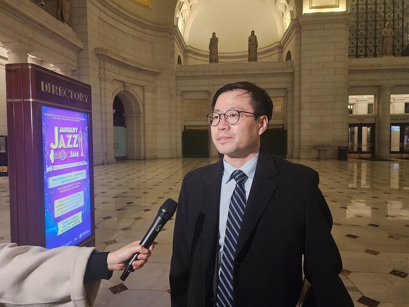 | ▲ Trade Minister Yeo Han-koo speaks to the press at a train station in Washington, D.C., on Jan. 14, 2026. (Yonhap) |
