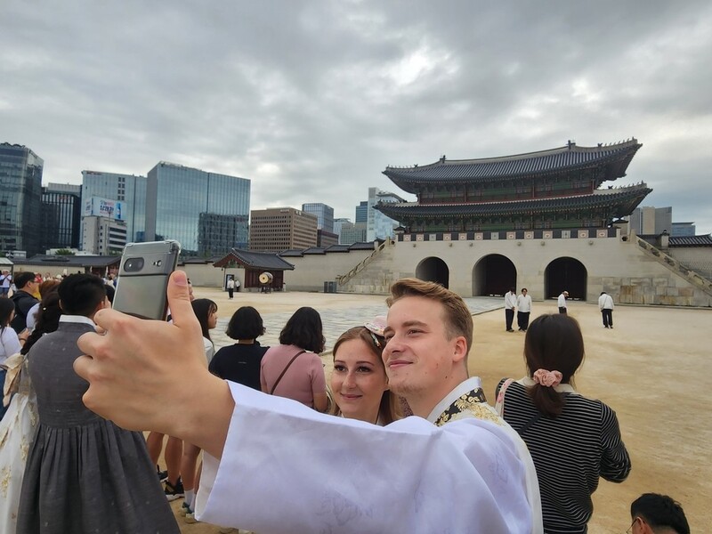 광화문과 흥례문 사이의 광장에서는 한복을 차려입고 추억을 남기려는 관광객의 발걸음이 이어졌다.