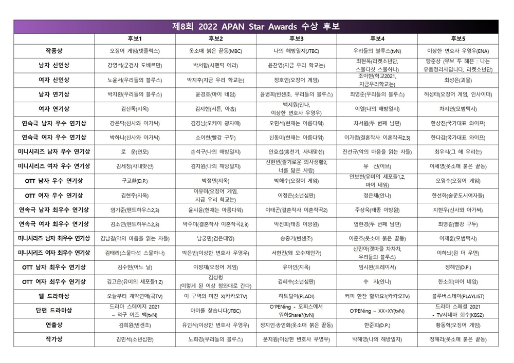| ▲ 2022 아시아태평양 스타 어워즈 후보작·후보자 리스트 [에이판 스타 어워즈 사무국 제공. 재판매 및 DB 금지] |