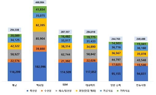 유통업태별로는 전통시장의 평균 구매 비용이 24만488원으로 가장 낮았고 이어 일반슈퍼마켓(24만4천763원), 대형마트(28만4천818원), 기업형 슈퍼마켓(28만7천357원), 백화점(46만8천84원) 순이었다.