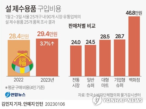 (서울=연합뉴스) 이신영 기자 = 올해 설 차례상을 차리는 데 드는 비용이 지난해보다 3.7% 늘어나 29만4천338원이 필요하다는 조사 결과가 나왔다.