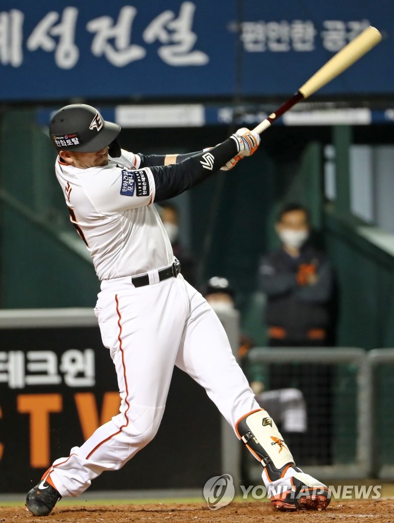 | ▲ In this file photo from April 21, 2021, Ryon Healy of the Hanwha Eagles hits an RBI double against the Kiwoom Heroes in the bottom of the fifth inning of a Korea Baseball Organization regular season game at Hanwha Life Eagles Park in Daejeon, 160 kilometers south of Seoul. (Yonhap) |