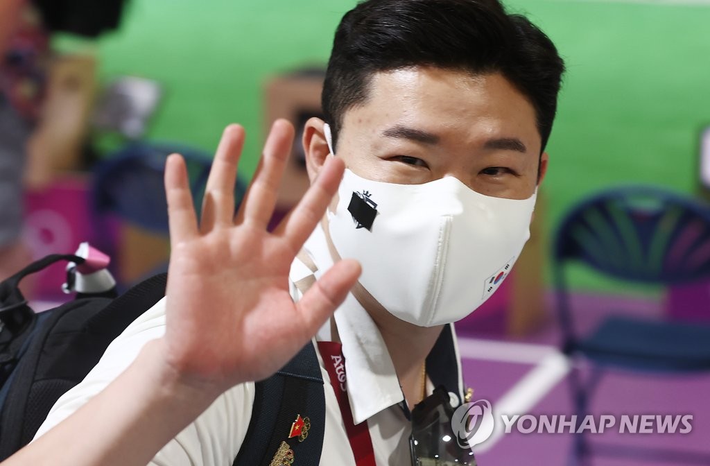 | ▲ South Korean shooter Jin Jong-oh waves at cameras after the qualification round of the men's 10m air pistol event at the Tokyo Olympics at Asaka Shooting Range in Tokyo on July 24, 2021. (Yonhap) |