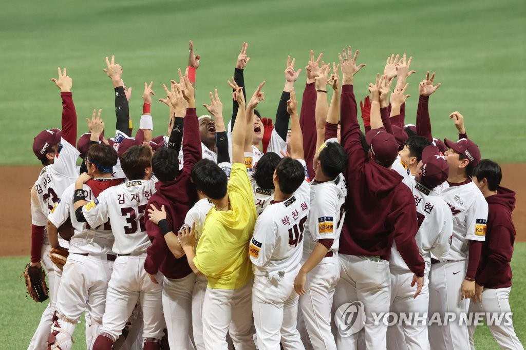 | ▲ Kiwoom Heroes players celebrate their 4-1 victory over the LG Twins in Game 4 of the second round in the Korea Baseball Organization postseason at Gocheok Sky Dome in Seoul on Oct. 28, 2022. The Heroes advanced to the Korean Series following this win. (Yonhap) |