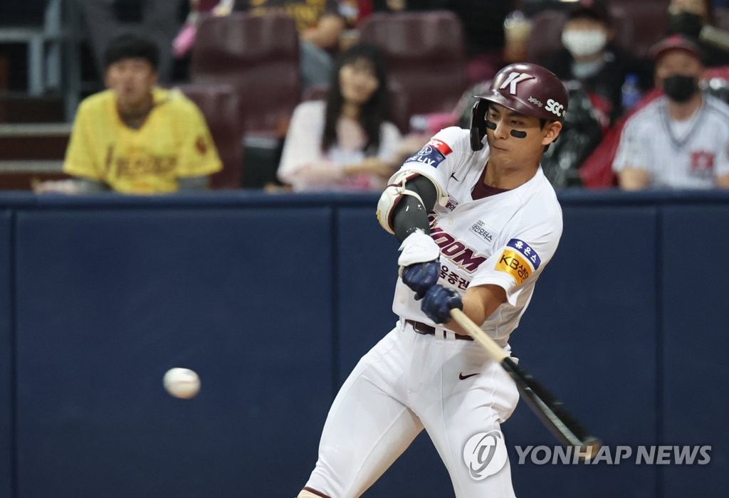 | ▲ Lee Jung-hoo of the Kiwoom Heroes hits a single against the LG Twins during the bottom of the first inning of Game 4 of the second round in the Korea Baseball Organization postseason at Gocheok Sky Dome in Seoul on Oct. 28, 2022. (Yonhap) |