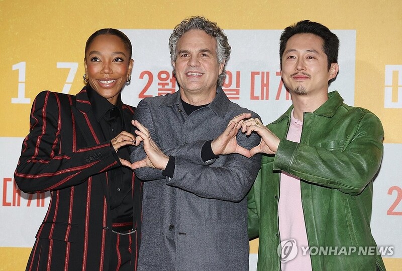 | ▲ Naomi Ackie (L), Mark Ruffalo (C) and Steven Yeun (R) pose for photos during a press conference for Bong Joon-ho's sci-fi black comedy "Mickey 17" in Seoul on Feb. 20, 2025. (Yonhap) |