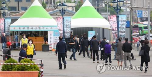 ▲ Citizens wait in line to receive virus tests at a makeshift virus testing clinic in Seoul on April 22, 2021. (Yonhap)