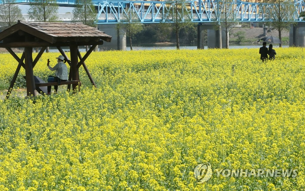 | ▲ 창녕 낙동강 유채밭 (창녕=연합뉴스) 이정훈 기자 = 낮 기온이 초여름을 방불케하는 27도까지 오른 12일 낮, 경남 창녕군 남지읍 낙동강 유채단지를 시민들이 한가롭게 거닐고 있다. 2022.4.12 seaman@yna.co.kr |