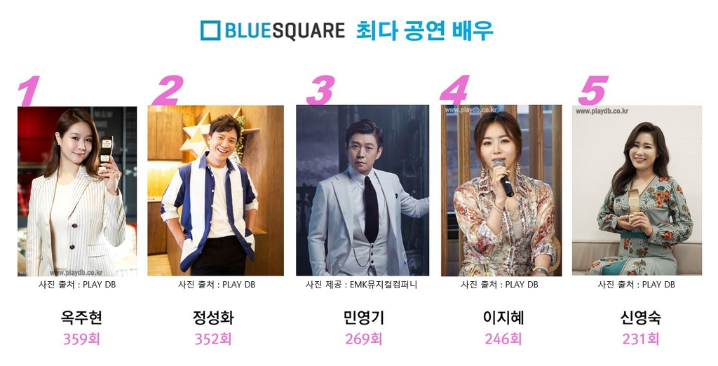 블루스퀘어에서 가장 많이 공연한 배우는 359회 무대에 오른 옥주현이다. 정성화(352회), 민영기(269회), 이지혜(246회), 신영숙(231회), 조정은(205회), 박은태(203회), 전동석(200회)이 뒤를 이었다.