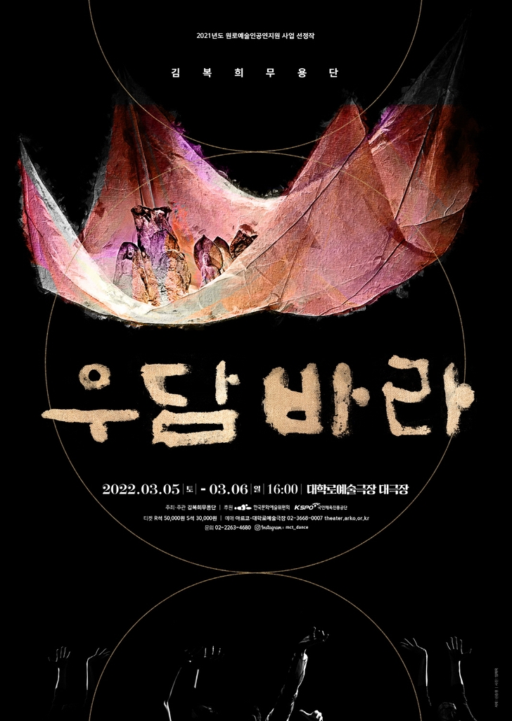 2부에선 지난해 김복희무용단 창단 50주년 기념작으로 선보인 '우담바라'를 무대에 올린다. 소설 '우담바라' 속 인물들의 내면과 핵심 장면을 춤으로 표현한다.