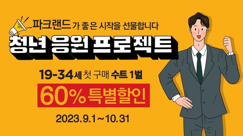 파크랜드는 "취업이나 결혼 준비를 해본 사람들은 새로운 시작을 준비하는 청년들이 얼마나 간절하고 막막한 순간이 많은지 알 것"이라며 "청년들의 부담을 덜어주고자 수트 60% 할인이라는 혜택을 제공하기로 했다"고 말했다.