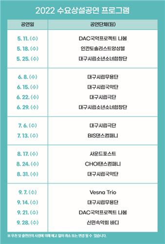 (대구=연합뉴스) 류성무 기자 = 대구문화예술회관은 오는 11일부터 9월 28일까지 매주 수요일 오후 7시 동편 야외무대에서 수요상설공연을 선보인다고 2일 밝혔다.