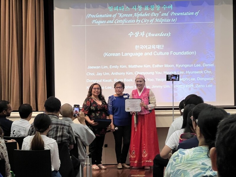 한국어교육재단(이사장 구은희)은 지난 1일 밀피타스시가 시립도서관 강당에서 한글 창제 580돌 기념식을 열어 '코리안 알파벳 데이(한글날)'를 선포하고 한국문화 체험행사를 열었다고 4일 밝혔다.