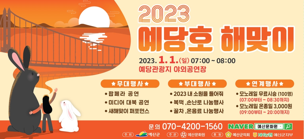 (예산=연합뉴스) 김소연 기자 = 충남 예산군은 2023년 새해 첫날인 1월 1일 예당호 야외공연장에서 해맞이 행사를 한다고 26일 밝혔다.