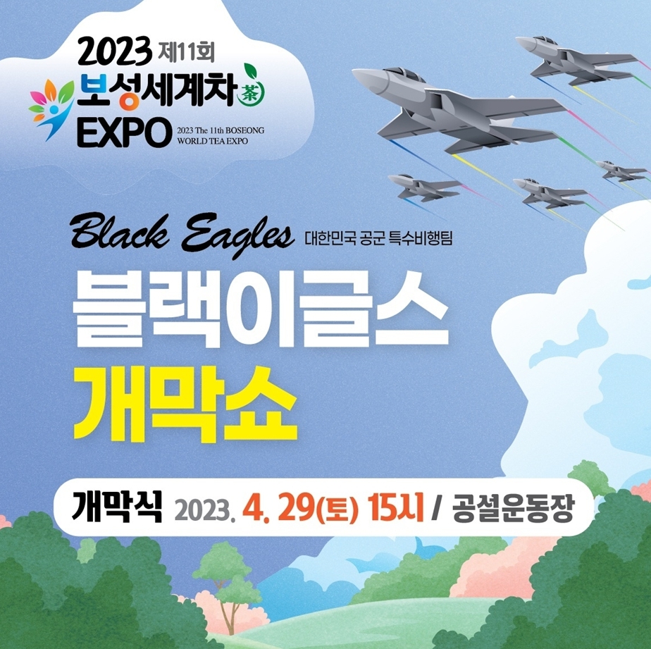 9일 보성세계차엑스포 조직위원회에 따르면 블랙이글스 에어쇼는 20여 분간 진행되며 화려한 비상으로 보성세계차엑스포 개막을 축하할 예정이다.