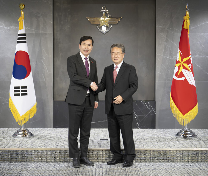 Acting Defense Minister Kim Seon-ho (L) shakes hands with acting U.S. Ambassador to South Korea Joseph Yun during their meeting at the defense ministry's building in Seoul on Jan. 24, 2025, in this photo provided by the ministry. (PHOTO NOT FOR SALE) (Yonhap)