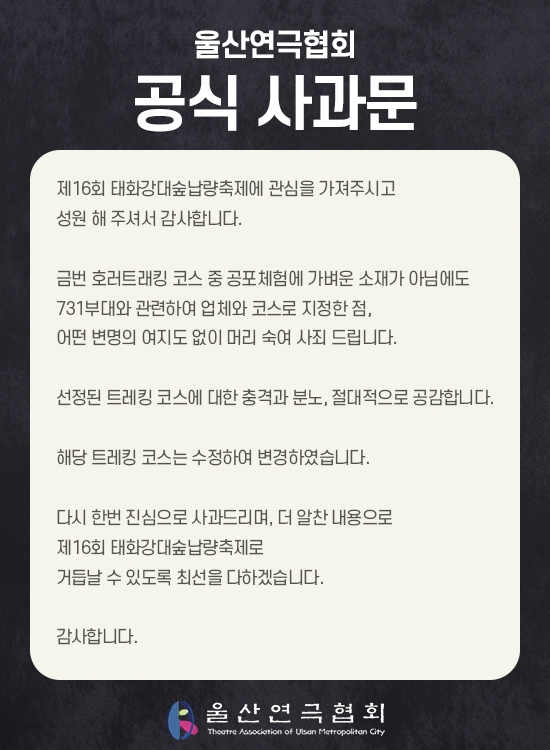 논란이 커지자 울산연극협회는 공식 사과문을 통해 "어떤 변명의 여지도 없이 머리 숙여 사죄드린다"고 말했다.