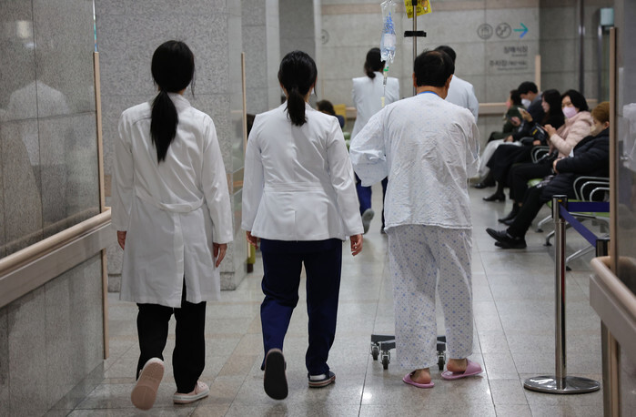 Medical workers walk at a university hospital in Incheon, west of Seoul, on March 11, 2024, amidst a collective action nationwide by more than 11,000 trainee doctors in its third week. Military and public health doctors commenced deployment to hospitals on the same day, in response to the ongoing medical crisis. (Yonhap)