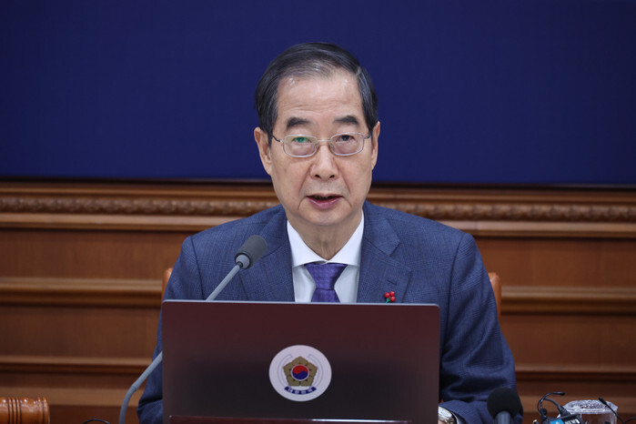 Prime Minister Han Duck-soo speaks during a Cabinet meeting at the government complex in Seoul on Jan. 30, 2024. The Cabinet approved a motion demanding the National Assembly reconsider a special bill mandating a new investigation into the Oct. 29, 2022, crowd crush, in which a surge during Halloween celebrations killed 159 people in the capital's Itaewon district. (Yonhap)