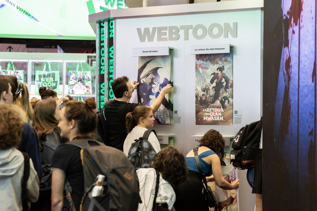 올해 네이버웹툰 부스에는 프랑스 독자들이 좋아하는 웹툰 '사신소년', '언니, 이번 생엔 내가 왕비야', '입학용병', '투신전생기', '화산귀환', '로어 올림푸스', '비커즈 아이 캔트 러브 유' 등 7편의 웹툰 포스터를 관람객들이 직접 뜯어갈 수 있도록 배치했다.