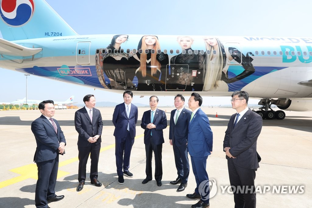 이날 행사에서는 부산엑스포 유치를 기원하는 의미로 글로벌 아티스트인 블랙핑크 멤버들 사진이 래핑된 대한항공 보잉 777-300ER 항공기가 공개됐다.
