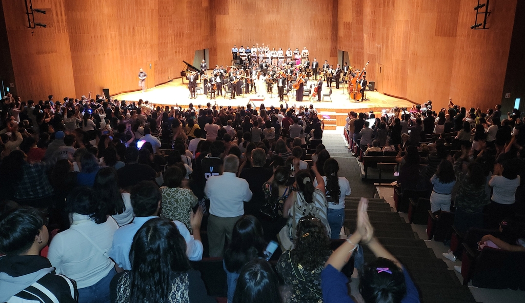 | ▲ K팝 오케스트라 공연 환호 (멕시코시티=연합뉴스) 이재림 특파원 = 15일(현지시간) 멕시코시티 오이인 욜리스틀리 문화원에서 열린 오푸멕스심포니오케스트라·합창단의 K팝 심포니 페스티벌 공연에서 청중이 연주자와 합창단에 박수를 보내고 있다. 2023.7.16 |