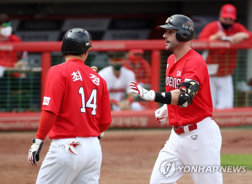 | ▲ In this file photo from Oct. 11, 2020, Jamie Romak of the SK Wyverns (R) is greeted by his teammate Choi Jeong after hitting a two-run home run against the Kia Tigers in a Korea Baseball Organization regular season game at Gwangju-Kia Champions Field in Gwangju, 330 kilometers south of Seoul. (Yonhap) |