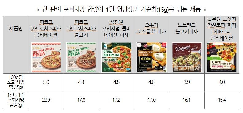 포화지방 함량이 가장 높은 제품은 피코크 콰트로치즈피자 콤비네이션(22.9g·한판 기준)이었다. 피코크 콰트로치즈피자 불고기(17.8g), 청정원 오리지널 콤비네이션 피자(17.2g), 오뚜기 치즈듬뿍 피자(17g), 노브랜드 불고기피자(16.1g), 풀무원 노엣지 꽉찬 토핑 피자 페퍼로니 콤비네이션(15.4g) 등도 1일 영양성분 기준치를 웃돌았다.
