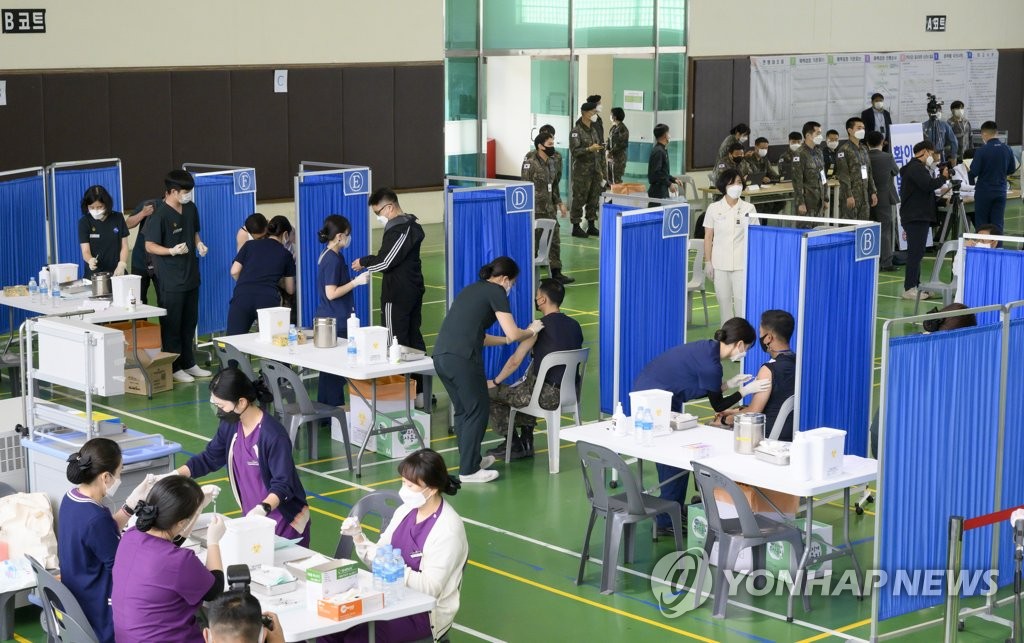 | ▲ Soldiers and military workers receive COVID-19 shots at the military headquarters in the central city of Gyeryong on April 28, 2021, in this photo provided by the Ministry of National Defense. (PHOTO NOT FOR SALE) (Yonhap) |