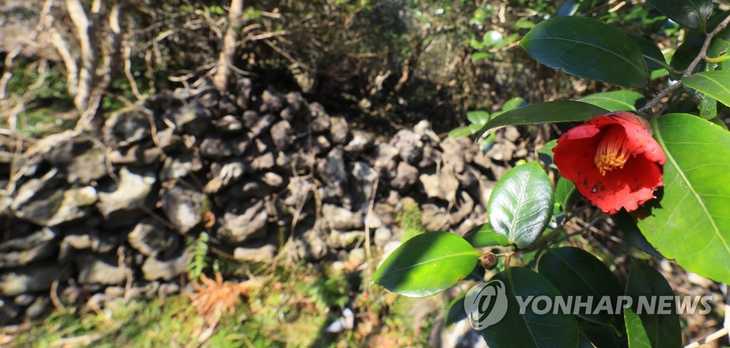 | ▲ 제주4·3사건 유적과 동백꽃 (서귀포=연합뉴스) 사진은 4·3의 상징으로 여겨지는 동백꽃과 세월이 흘러 많이 허물어진 4·3사건 관련 유적지 수악주둔소 내성벽 일부의 모습이다. 동백꽃은 4·3의 영혼들이 붉은 동백꽃처럼 차가운 땅속으로 소리 없이 스러져갔다는 의미를 내포하고 있다. [연합뉴스 자료사진] |