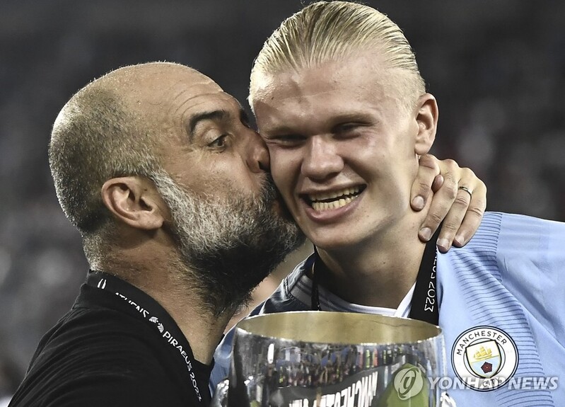 | ▲ 페프 과르디올라 감독의 키스를 받은 엘링 홀란 [AFP=연합뉴스] |