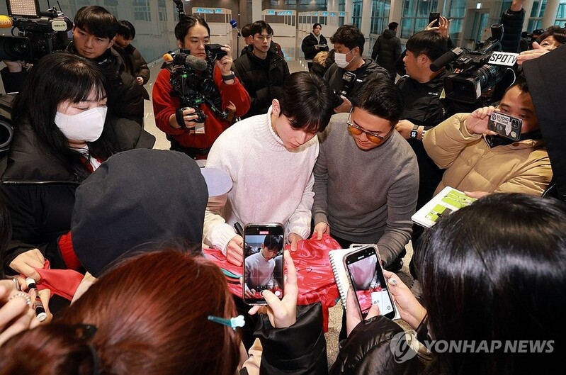 이날 공항엔 수십 명의 팬과 취재진이 모였다. 양민혁은 강원과 토트넘, 국가대표 유니폼을 손에 쥔 팬들에게 사인을 하기도 했다.
