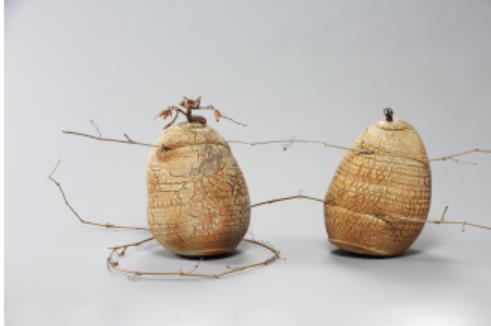 이번 전시에 선보이는 무유도기 작품은 고온의 장작가마에서 장작을 태울 때 날리는 재가 도기에 닿아 유리질을 형성해 자연유의 신비함을 보여준다.